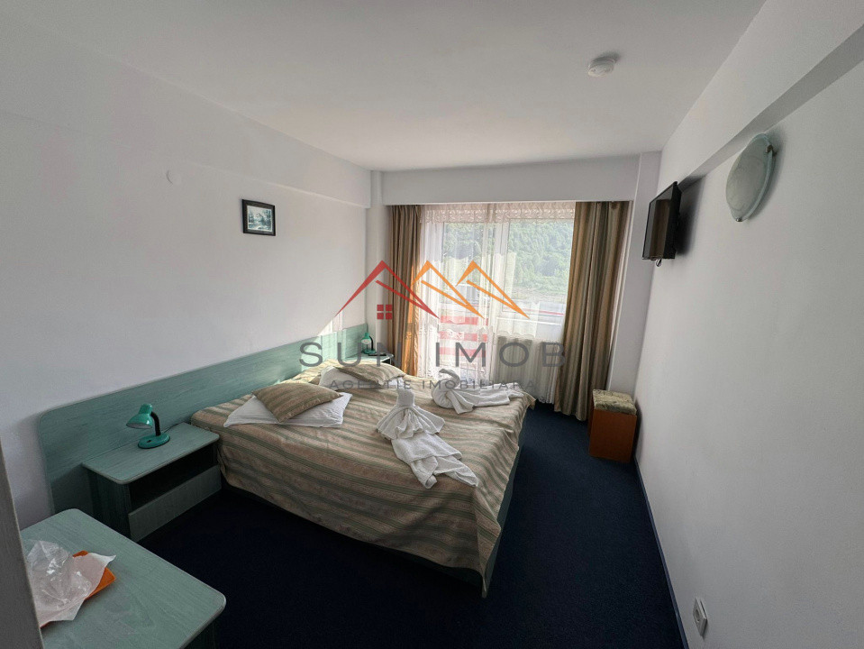 Hotelul, nefuncțional în prezent, dispune de 23 de camere distribuite pe 3 etaje, la care se adaugă un apartament cu 4 locuri. Camerele sunt dotate cu baie proprie și televizor, iar cele situate pe față beneficiază de balcon. La nivel funcțional, imobilul este complet echipat pentru operare, incluzând recepție, bar, grupuri sanitare pentru clienți, vestiare și grupuri sanitare pentru personal, spații tehnice și de depozitare, precum și un sistem de apă caldă alimentat de panouri solare cu rezervor de aproximativ 1000 litri. Zona de spălătorie este complet utilată, inclusiv cu calandru la 380V, iar fluxurile sunt bine organizate, existând acces separat pentru turiști și personal. Hotelul dispune de restaurant atât la parter, cât și la etaj, precum și de bucătărie profesională complet echipată cu cuptor de pizza, aragaze profesionale, frigidere și echipamente din inox, fiind pregătit pentru reluarea activității după reabilitare.